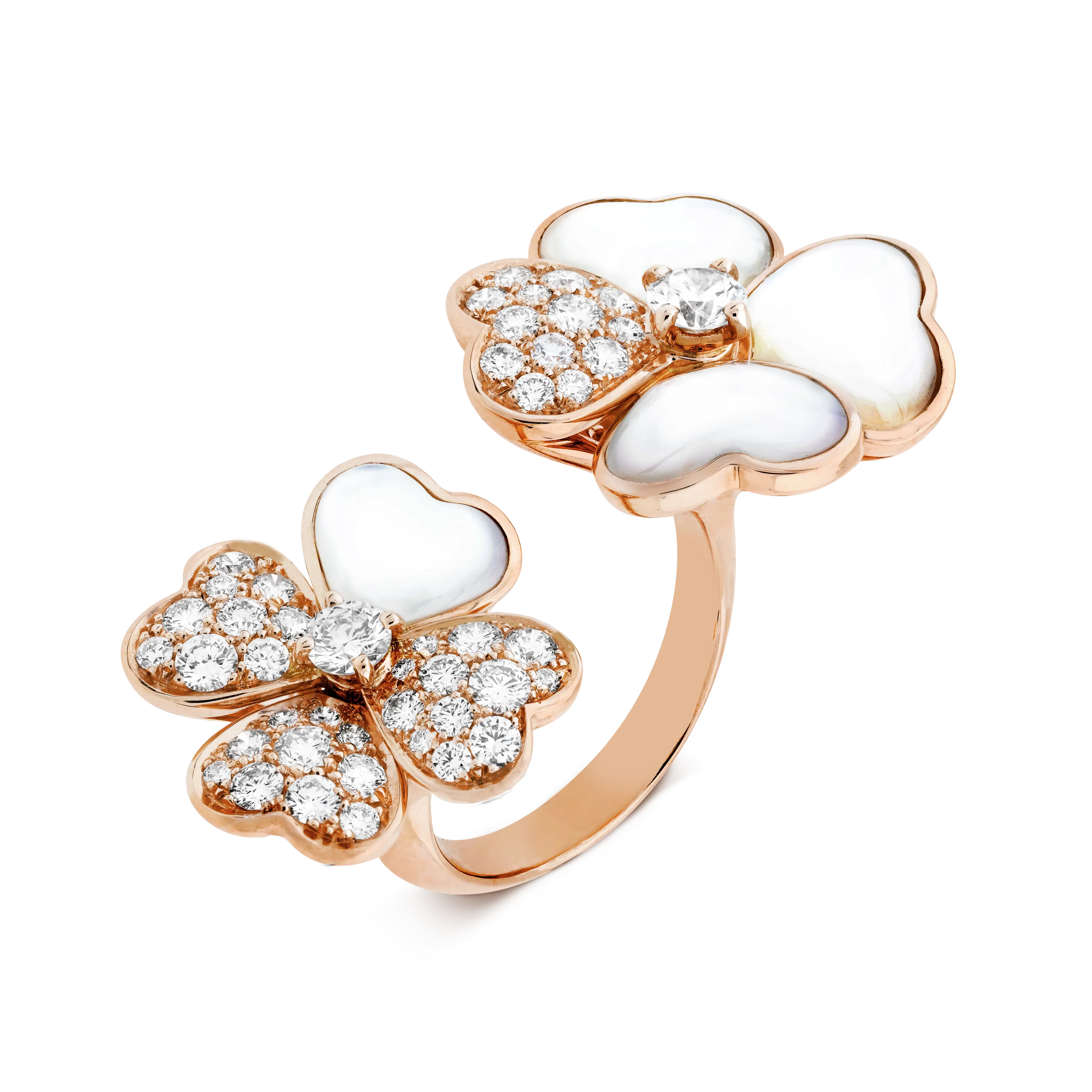 Cosmos Between the Finger Ring, 18K rose gold, white mother-of-pearl, round diamonds, two 0.14 ct and 0.29 ct round diamond centers; diamond quality DEF, IF to VVS.