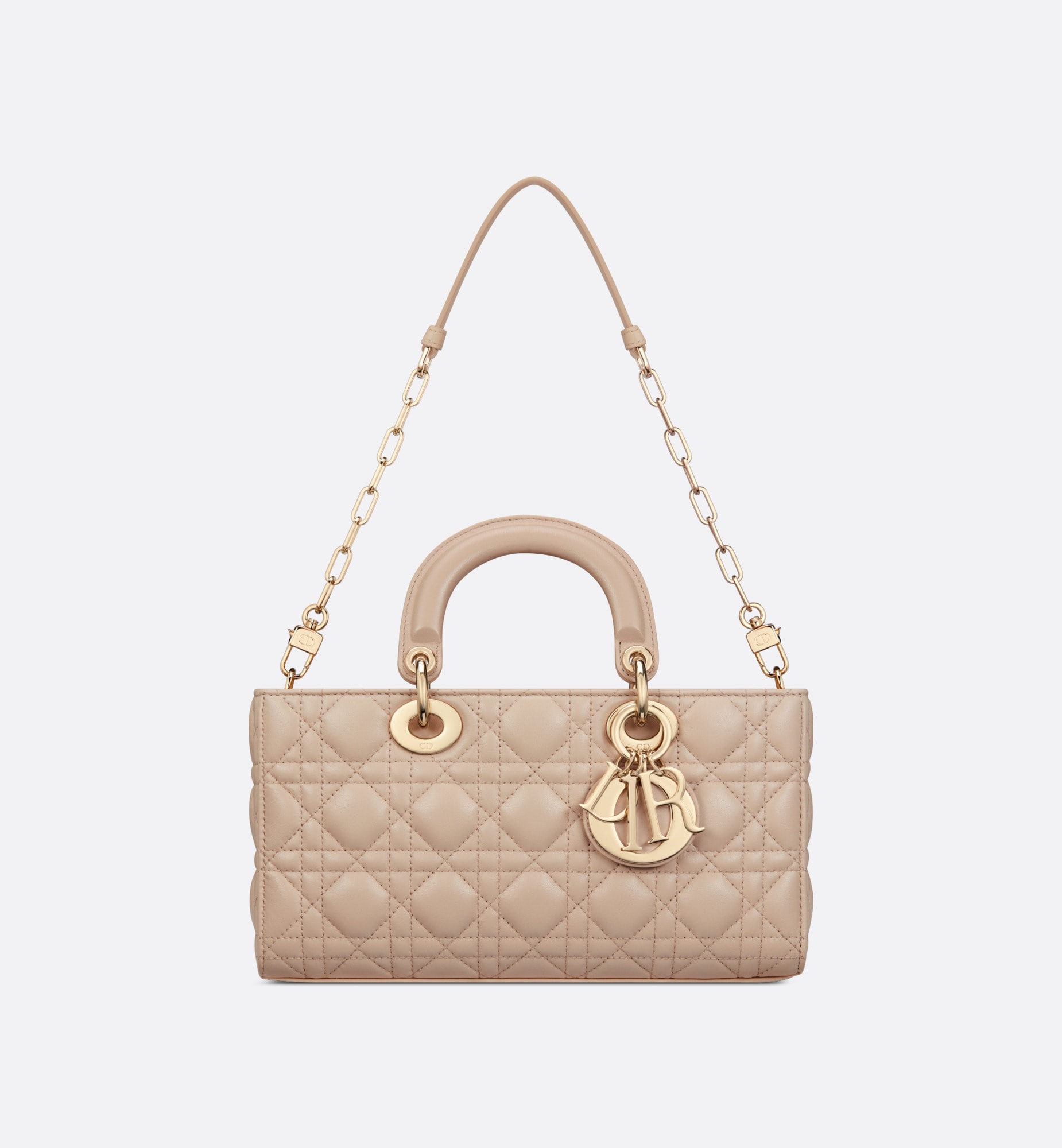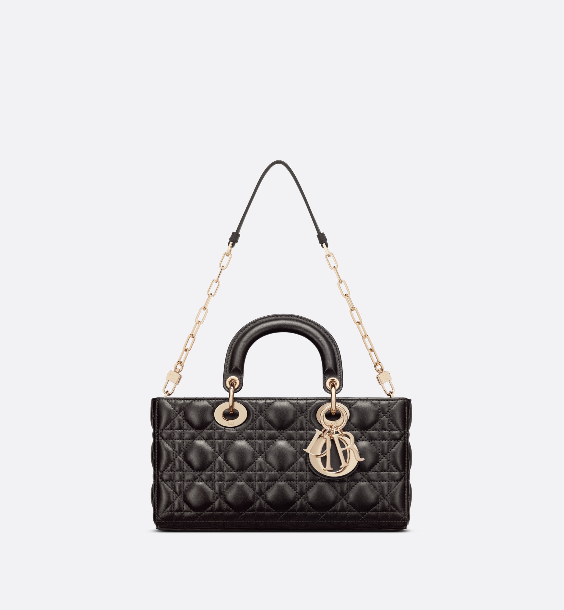メゾンのビジョンであるエレガンスと美を体現した「レディ D-ジョイ」バッグ。「レディ ディオール」ラインらしい、すっきりとしたデザインが魅力です。ホライゾンブルーのラムスキンに「カナージュ」ステッチを施した、洗練されたタイムレスなスタイルに仕上げました。ペールゴールドトーンのメタル製D.I.O.R.チャームがシルエットを上品に引き立てます。取り外しが可能なチェーン ショルダーストラップと、長さの調節と取り外しが可能なレザー ショルダーストラップが1本ずつ付属。ハンドバッグとしてはもちろん、ショルダーバッグやクロスボディバッグとしてもお楽しみいただけ、普段使いに最適なミディアムサイズのモデルです。