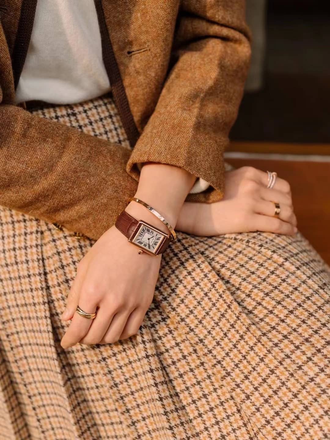 大人らしいセンスと自信が欲しいあなたには【タンク ルイ カルティエ】大人の品格が宿るアールデコ様式のクラシカルなデザインに色褪せない永遠性を感じる。こっくりとしたキャメルカラーのストラップで、ダイヤルのノーブルな印象をよりいっそう引き立てて。