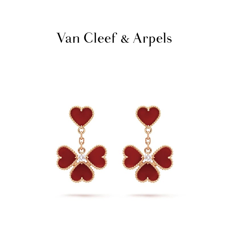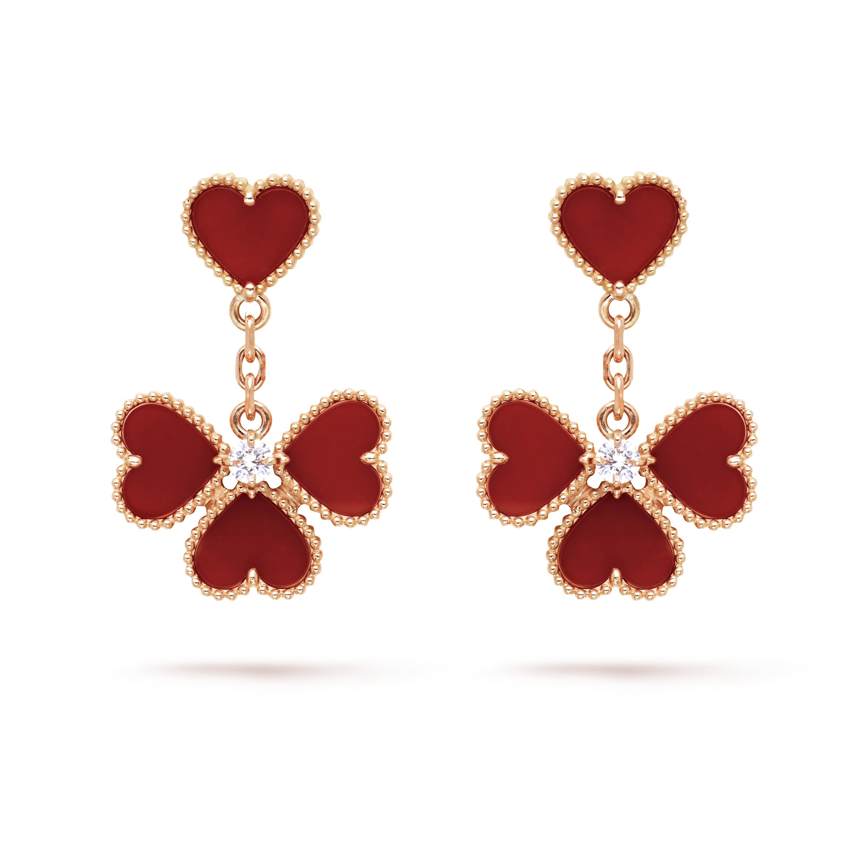 Sweet Alhambra effeuillage earrings, 18K rose gold, carnelian, round diamond; diamond quality DEF, IF to VVS.