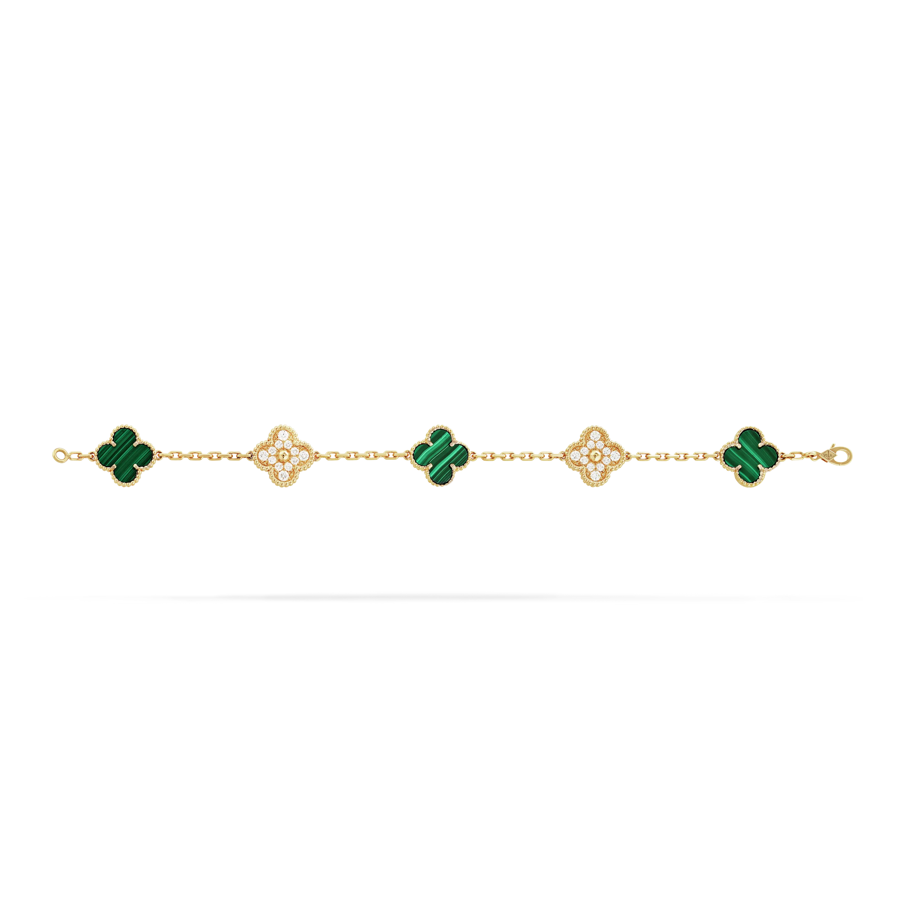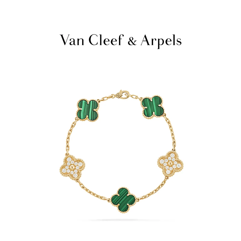 Vintage Alhambra bracelet, 5 motifs, 18K yellow gold, malachite, round diamonds; diamond quality DEF, IF to VVS.
