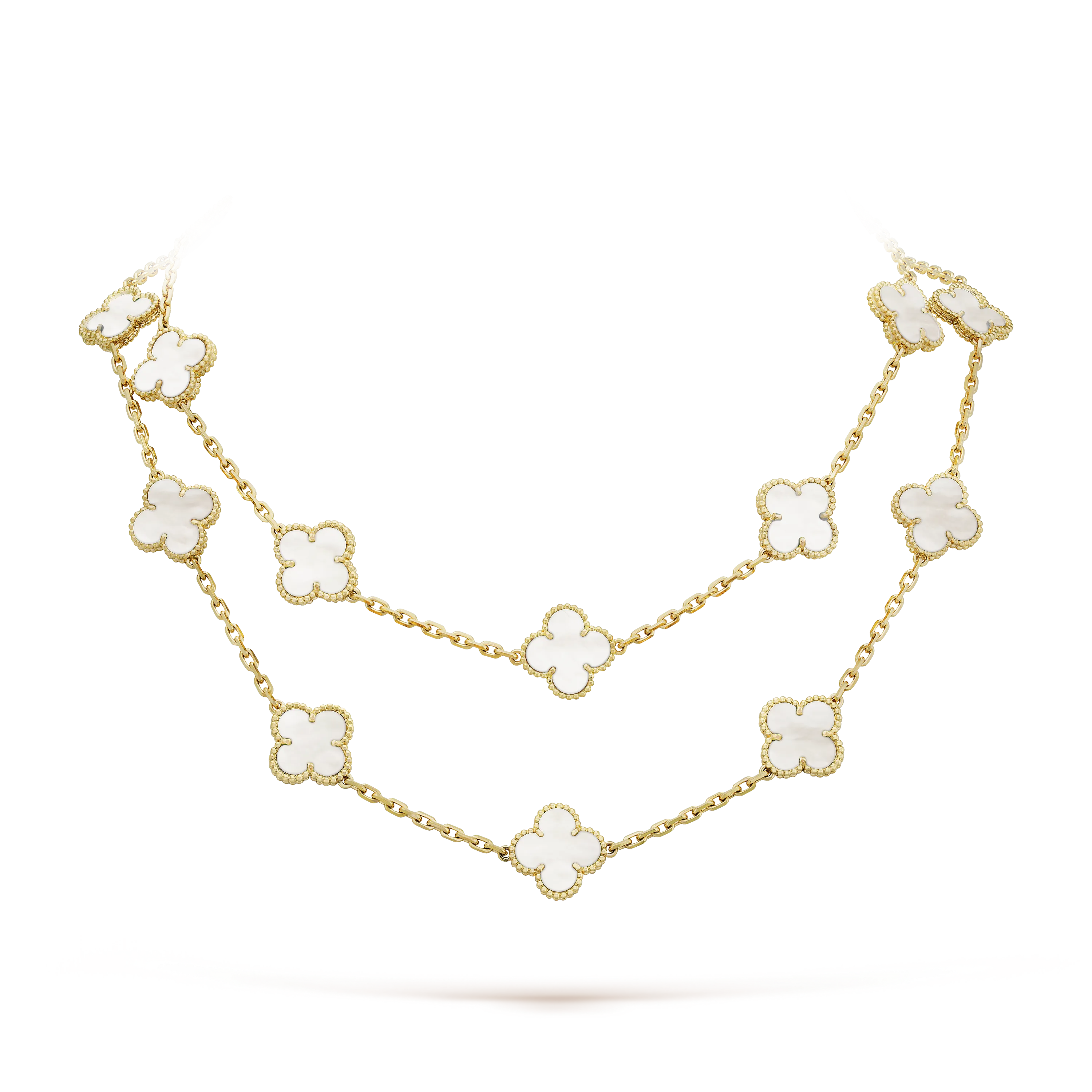 Vintage Alhambra long necklace, 20 motifs, 18K yellow gold, white mother-of-pearl.